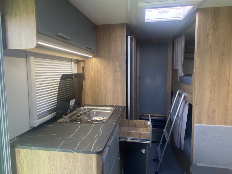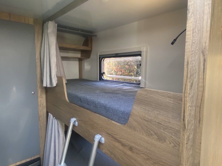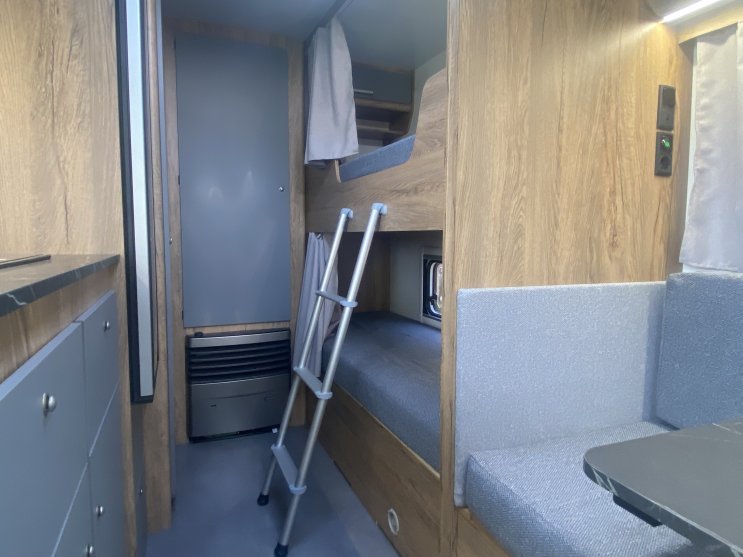W przyczepie jest łóżko podwójne oraz dwa łóżka pojedyncze w formie łóżka piętrowego. można rónież dostosować dodatkowe małe miejsce do spania.
