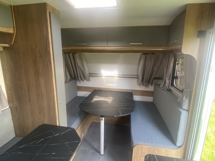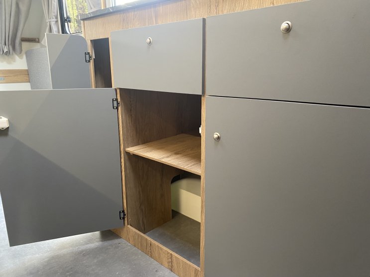 Szafki i schowki w przyczepie służą do przechowywania naczyń kuchennych, produktów, ubrań, pościeli itp. okna przyczepy posiadają rolety a drzwi wejściowe wyposażone są w moskitierę. Zainstalowane jest oświetlenie wewnętrze i zawnętrznę, akumulator 80Ah, butla gazową. Na dachu przyczepy zamontowany jest panel słoneczny, który doładowuje akumulator. Akumlator wystarcza do dorażnego korzystania z oświetlenia. Przyczepę można rónież podłączyć do zewnętrzego zasilania prądem. Przyczepa wyposażona jest w wewnętrzną instalację elektryczną z gniazdkami 230V i gniazdami USB oraz USB typ C. Przyczepa wyposażone również w ogrzewanie elektryczne i podgrzewacz do Ciepłej wody, które działają jedynie w przypadku zewnętrzego zasilania.