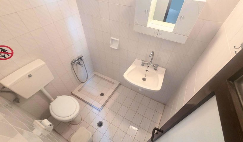 W łazience jest prysznic, umywalka, toaleta, kosz na śmieci. Na balkonie znajduje się stolik z krzesłami.