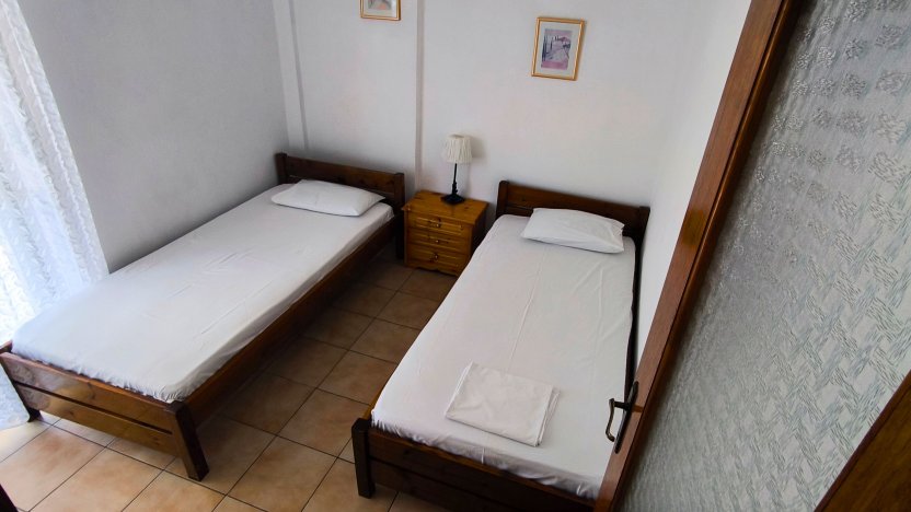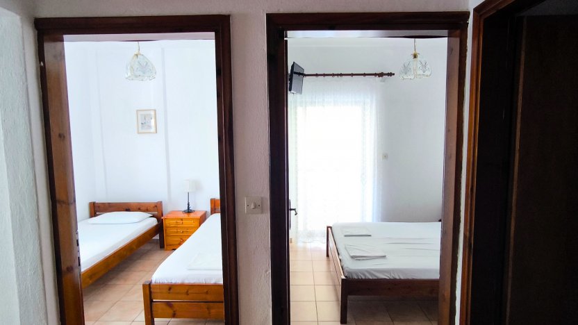 Apartament dla 4 osób – dwupokojowe studio z kuchnią, łazienką i balkonem. Przestronny apartament składa się z dwóch osobnych sypialni – jedna wyposażona jest w łóżko typu DBL (140 cm x 200 cm), druga w dwa łóżka typu SGL (90 cm x 200 cm), co zapewnia wygodę i prywatność wszystkim gościom. Apartamenty usytuowane są na pierwszym oraz drugim piętrze.